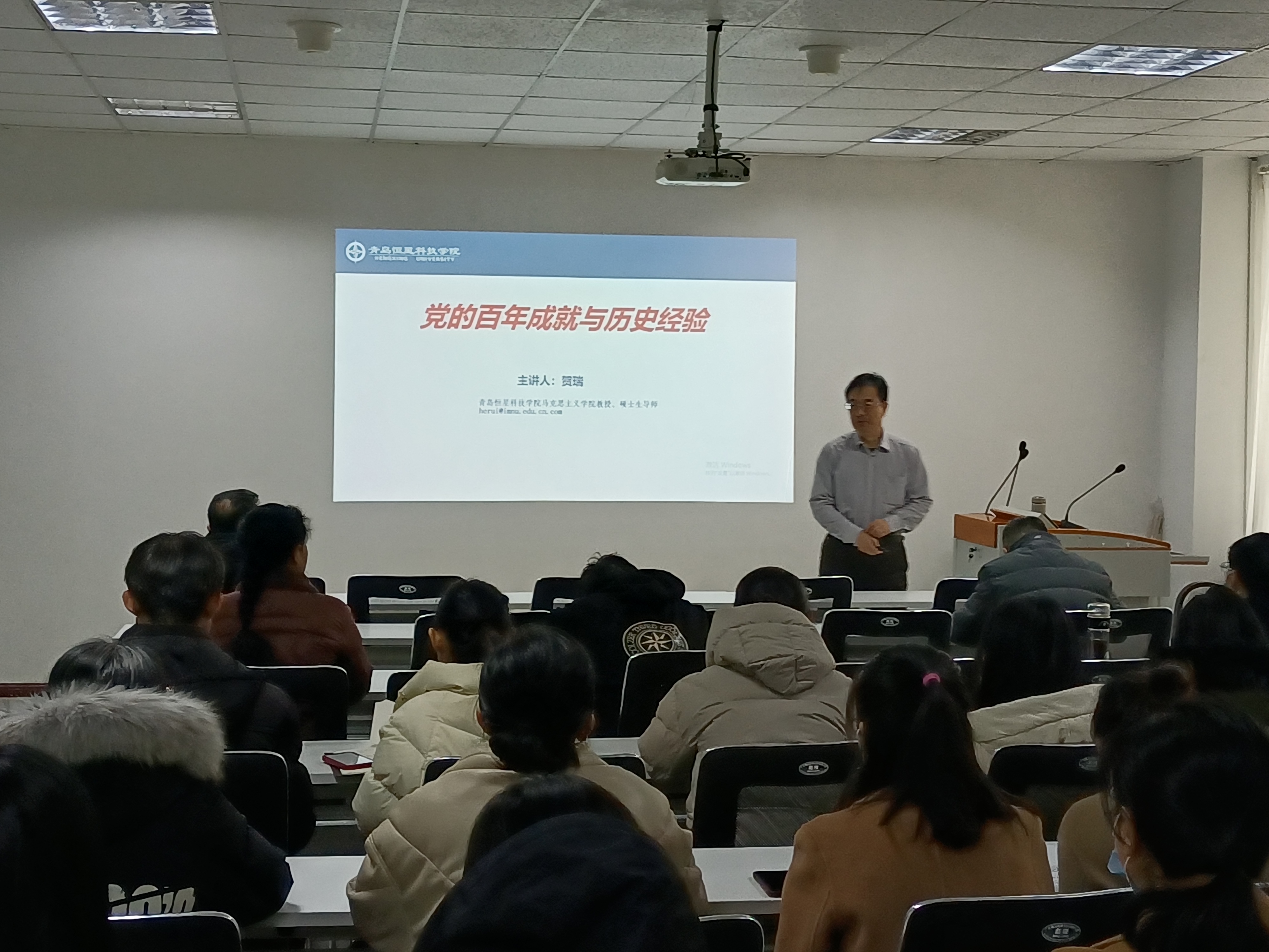 在热烈的掌声中,贺教授做了题为《党的百年成就与历史经验》学术讲座。讲座的内容大体分为四个部分:一.从百年源起看中国共产党为什么行;二.从百年成就看中国共产党为什么能;三.党百年奋斗取得的伟大成就与历史经验;四.不忘初心,牢记使命,开创新的百年辉煌。