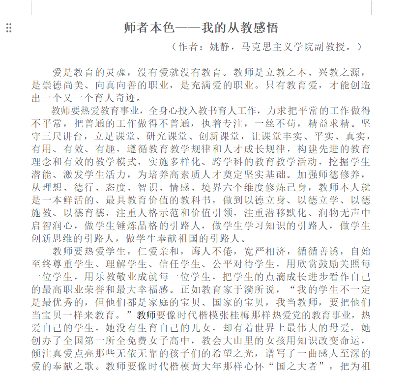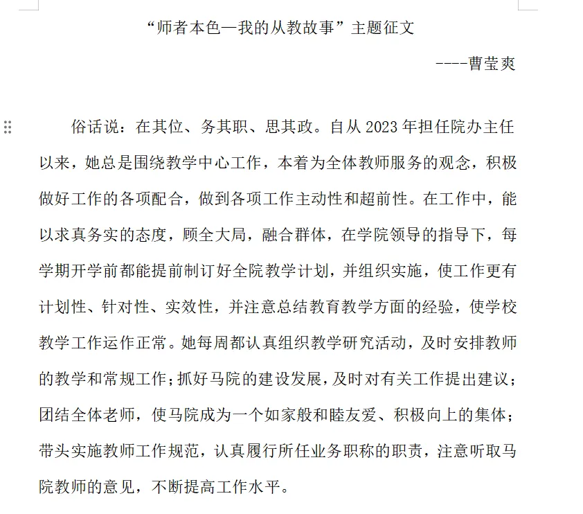 2024年9月1至9月9日,马克思主义学院在全体教师中开展“师者本色-我的从教故事”征文活动,通过活动讲好立德树人、教书育人故事。