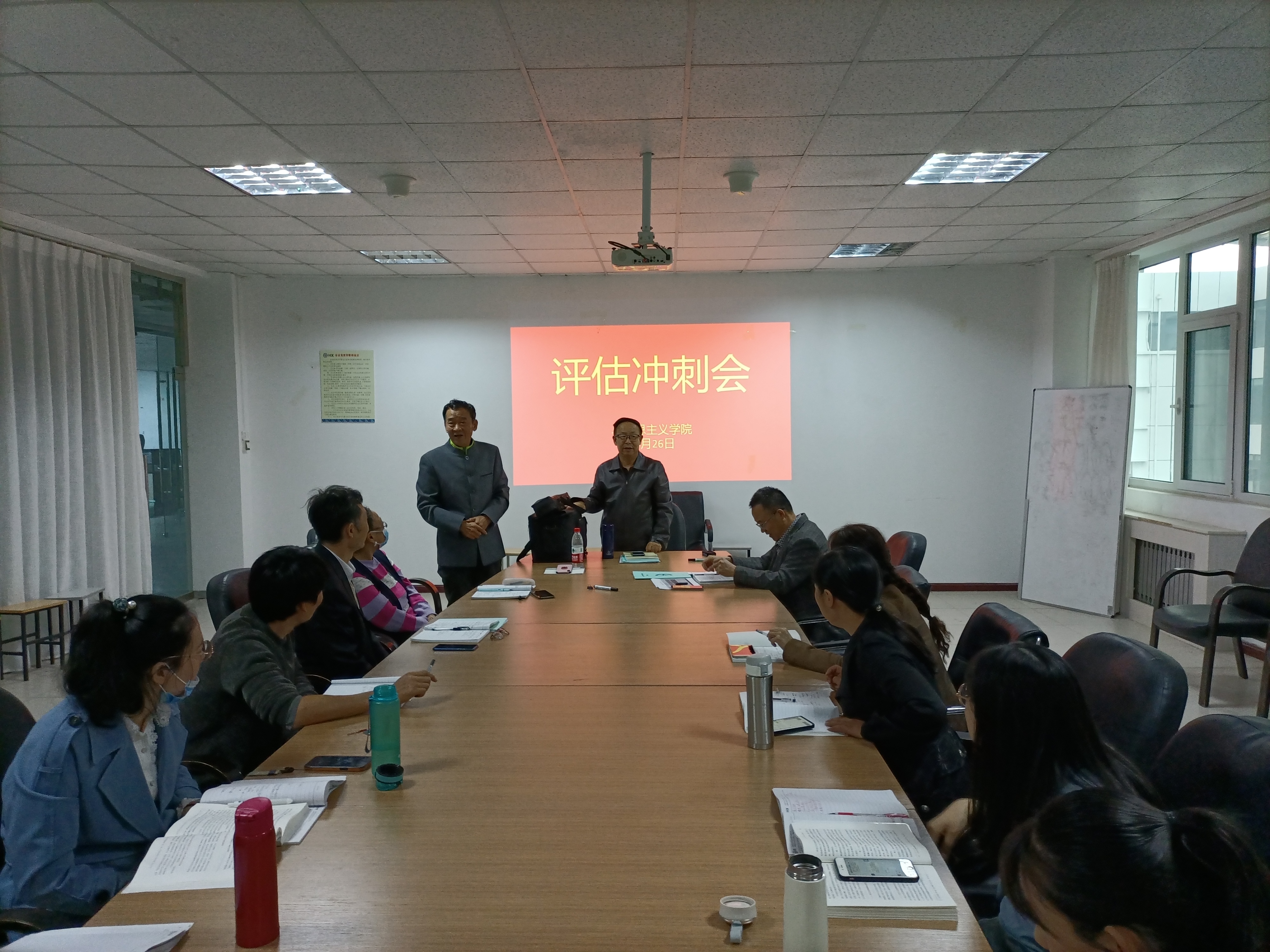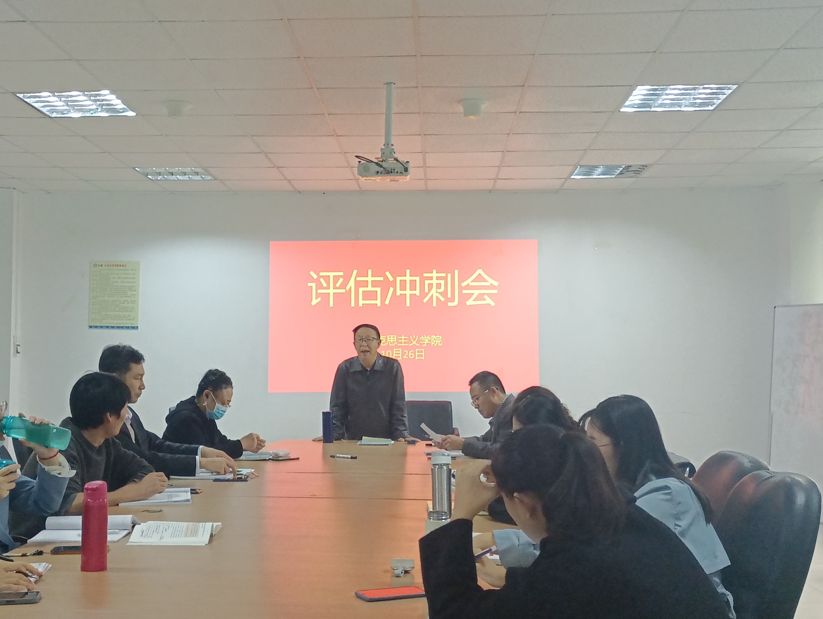 为迎接即将到来的本科教学合格评估,更好的做好评估期间的学院的各项工作,2021年10月26日下午,马克思主义学院在图书馆第六会议室召开本科评估冲刺会。出席本次会议的有杨福和院长、张至昊副院长、张王庚副校长及马克思主义学院全体教师,教学助理刘锁霞老师主持了本次会议。