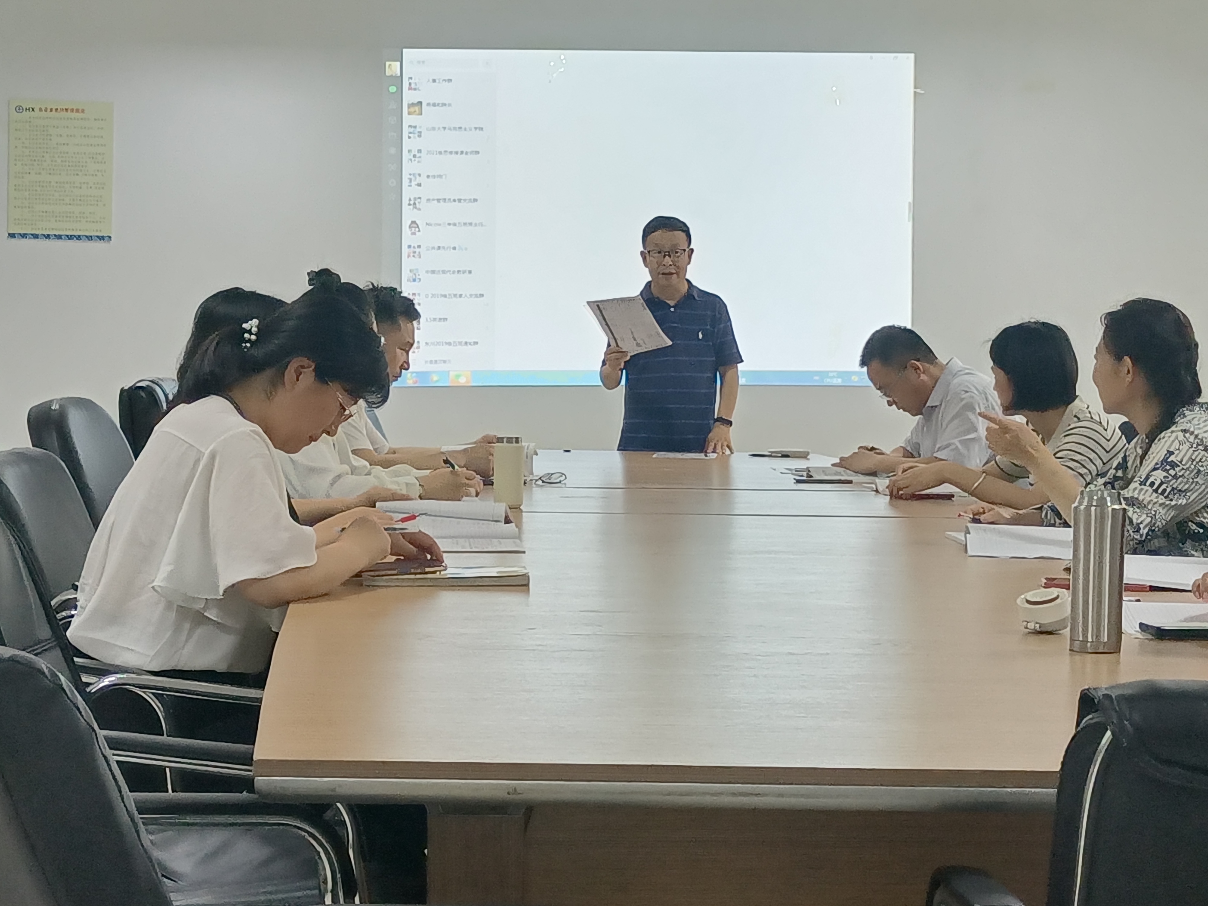 会议首先由杨福和院长传达了学校董事长关于本科教学评估的会议精神。杨院长再次向大家强调了本科教学评估的重要性,要求大家务必领会董事长关于本科教学评估的会议精神并切实落实到工作当中去,确保下学期的本科教学评估顺利通过。接着,马院党支部书记张至昊对近期的工作进行了详细地安排,并制定了工作日程表。张书记要求大家务必按照工作日程表的要求有序、高效的推进各项工作,同时要求各教研室针对下学期课程有计划地进行备课、磨课等工作,为下学期高质量的课堂教学打下坚实的基础。