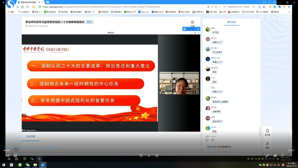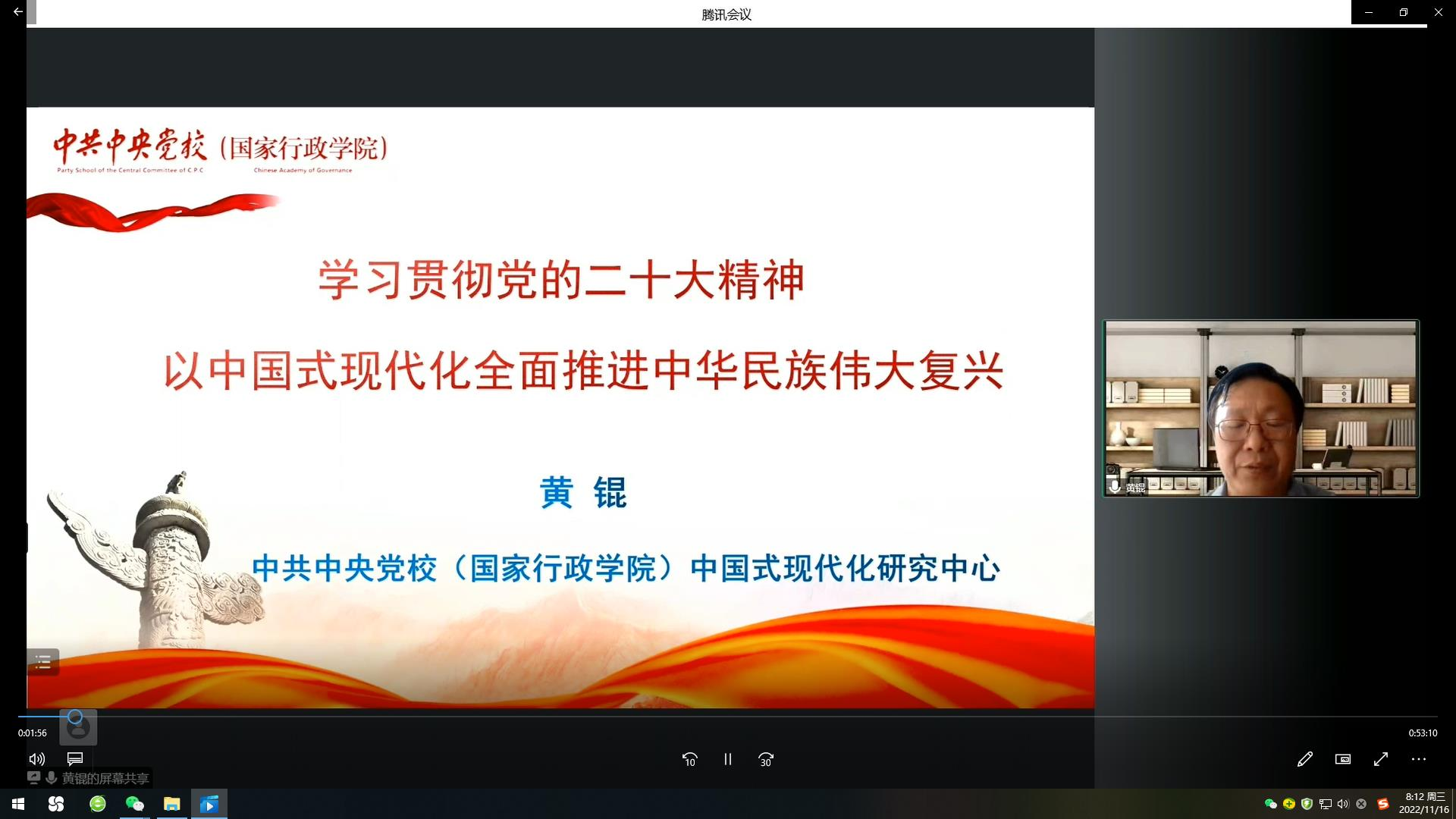 为深入学习贯彻党的二十大精神,全面理解中国式现代化的深刻内涵,2022年11月15日下午14:00,马克思主义学院党支部全体党员在图书馆七楼资料室集体学习收看了中共中央党校(国家行政学院)中国式现代化研究中心副主任、经济学博士黄锟教授的线上讲座——《学习贯彻党的二十大精神,以中国式现代化全面推进中华民族伟大复兴》。