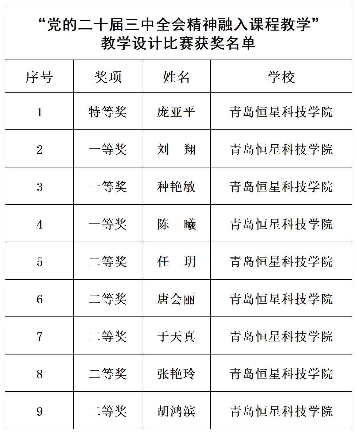 根据市委教育工委《关于组织开展“党的二十届三中全会精神融入课程教学”教学设计比赛活动的通知》(青教工委〔2024〕36号),经过各高校认真选拔推荐和市委教育工委审核、专家评审,马克思主义学院共有9名教师斩获佳绩,其中特等奖一名,一等奖三名,二等奖五名,展现了学校在推动党的创新理论融入课堂教学方面所取得的成就。