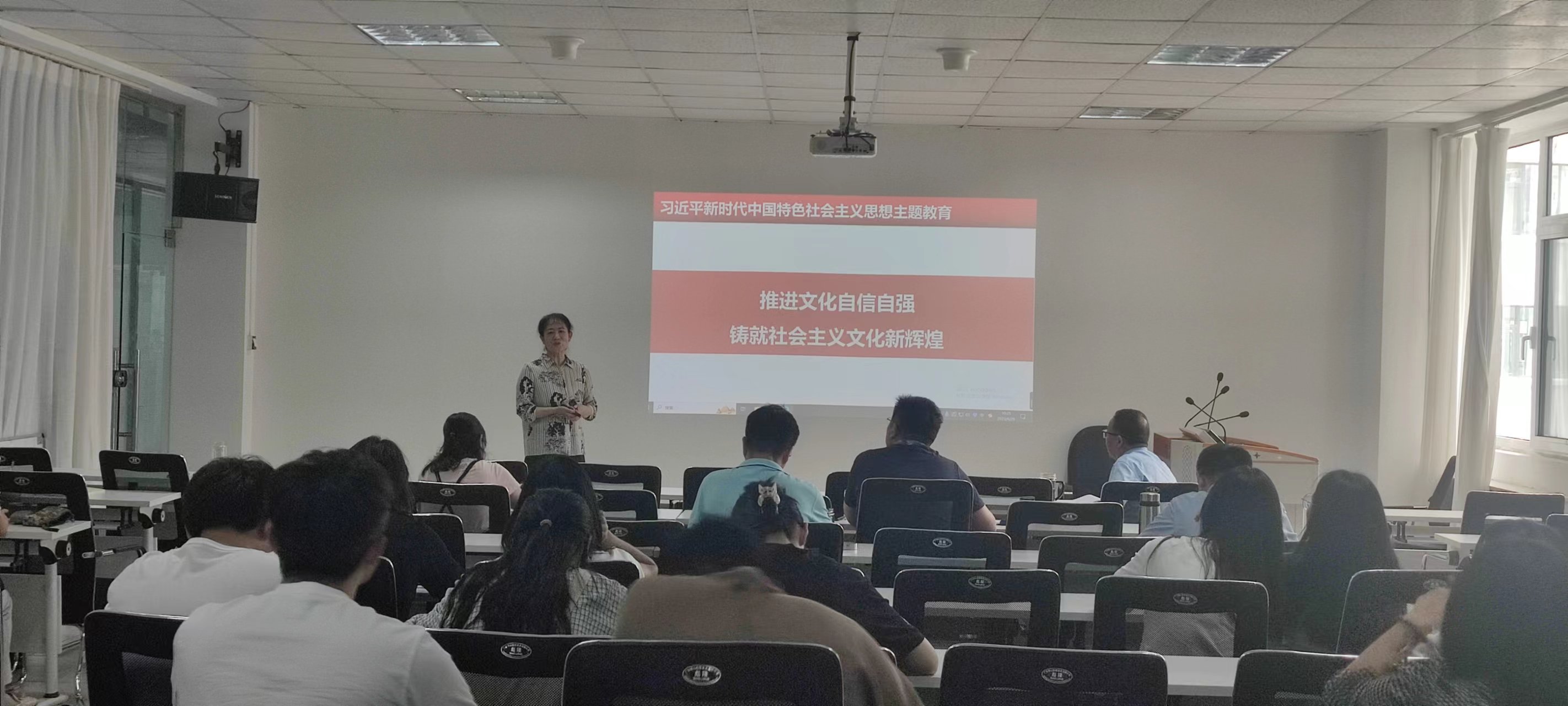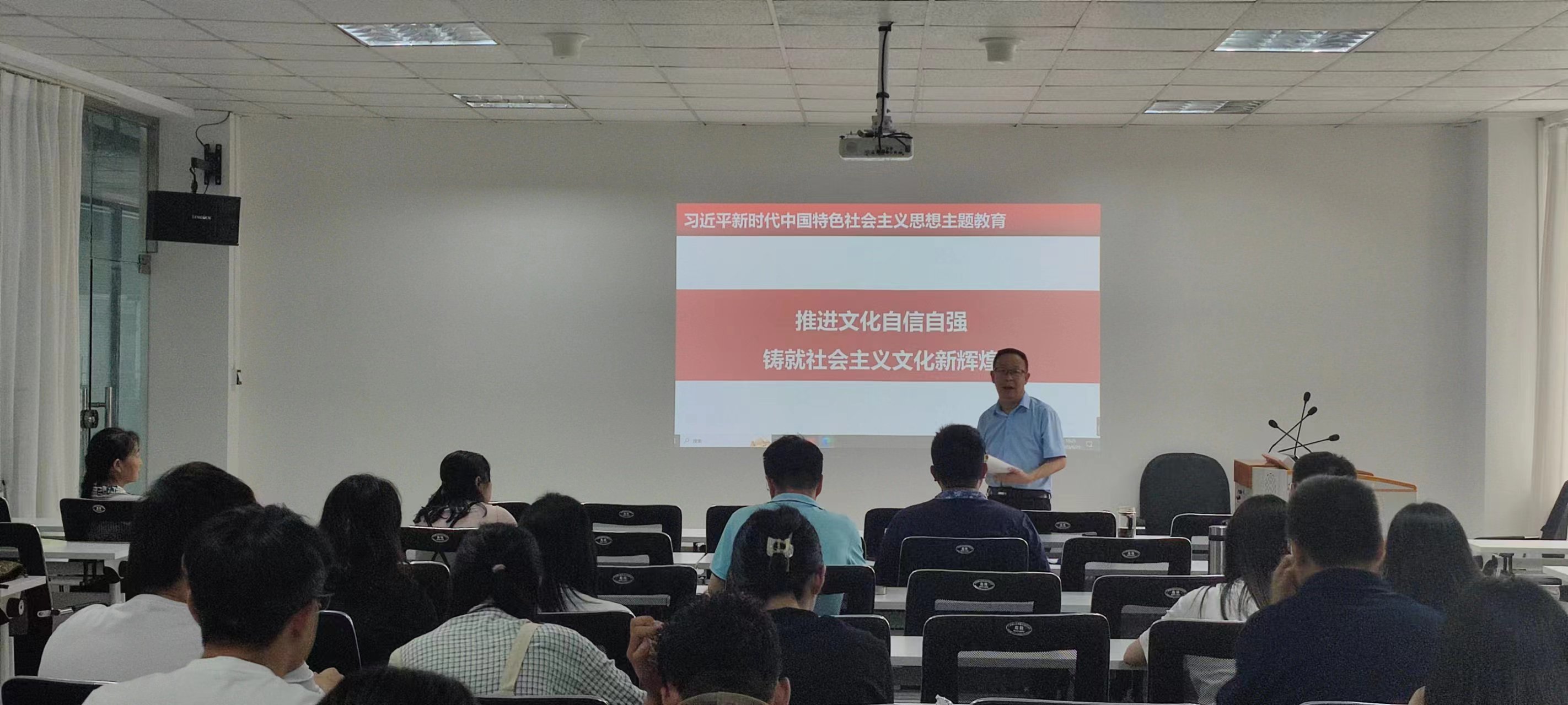 为深入学习贯彻习近平新时代中国特色社会主义思想,加强全院教师的思想政治建设,提高教师的思想政治课理论水平,2023年6月29日上午10:10,马克思主义学院在图书馆第六会议室开展第四次学习习近平新时代中国特色社会主义思想主题教育活动。本次学习的内容为《推进文化自信自强,铸就社会主义文化新辉煌》,主讲人为马院教授杨树虹,马克思主义学院全体教师参加。