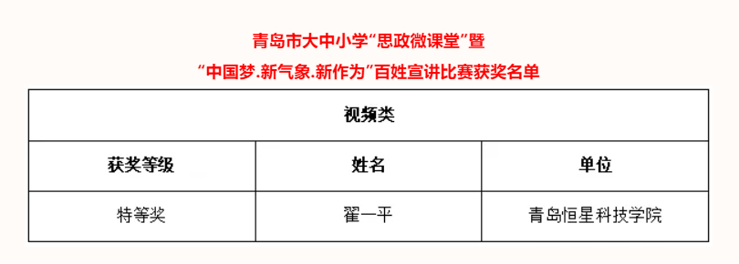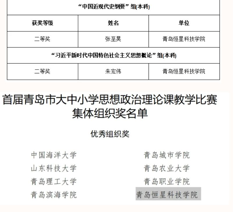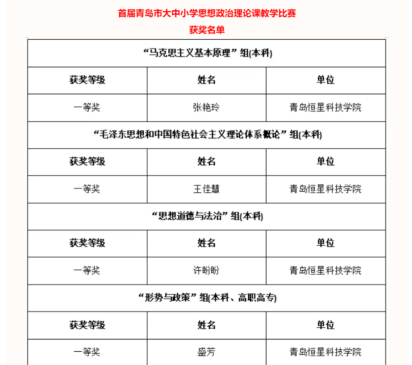 近日,首届青岛市大中小学思想政治理论课教学比赛及大中小学“思政微课堂”比赛结果公布。我校马克思主义学院共有7名教师获奖,其中张艳玲、王佳慧、许盼盼、盛芳在青岛市大中小学思想政治理论课教学比赛获一等奖,张至昊、朱宏伟获二等奖,翟一平老师获大中小学“思政微课堂“视频类”特等奖。青岛恒星科技学院获评“最佳组织奖”。