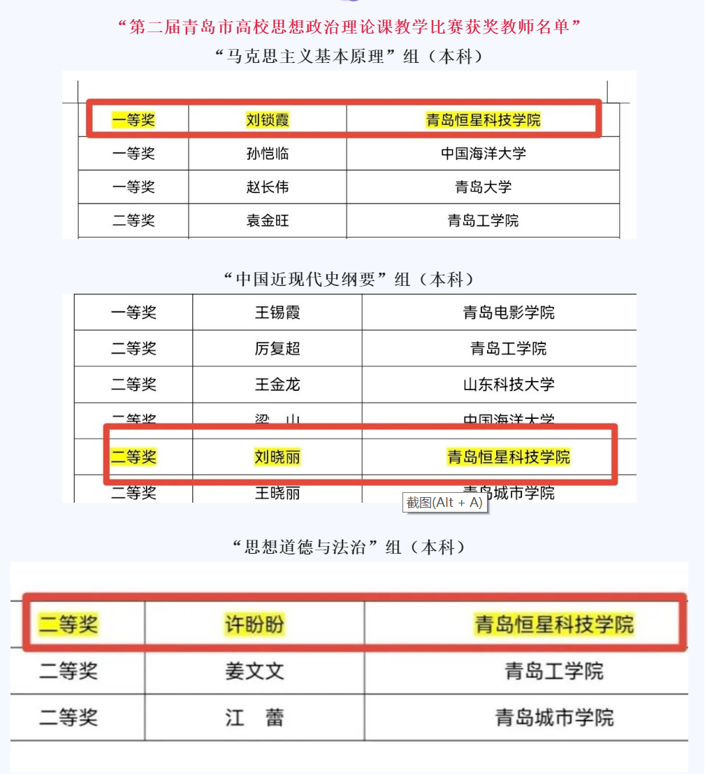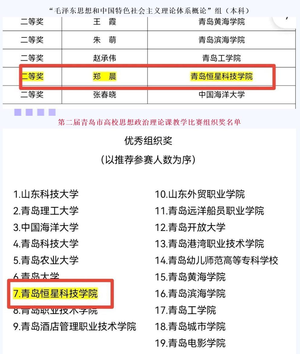近日,由青岛市委教育工委开展的第二届青岛市高校思想政治理论课教学比赛”评选活动落下帷幕。我校马克思主义学院积极备赛、参赛,共斩获奖项5项,其中教师刘锁霞获一等奖,教师刘晓丽、许盼盼、郑晨均获二等奖,青岛恒星科技学院获优秀组织奖。