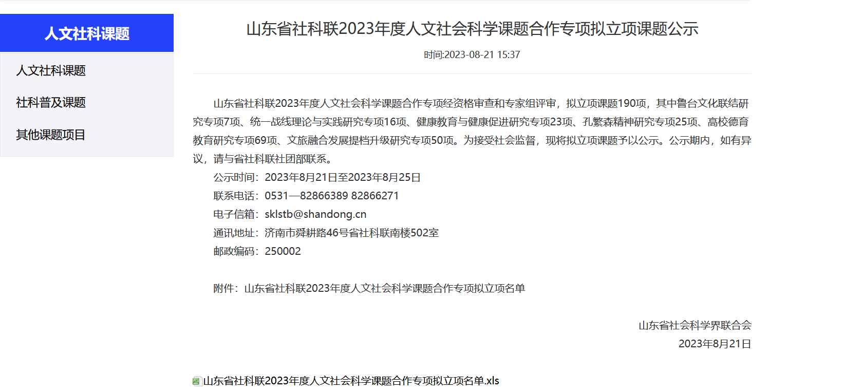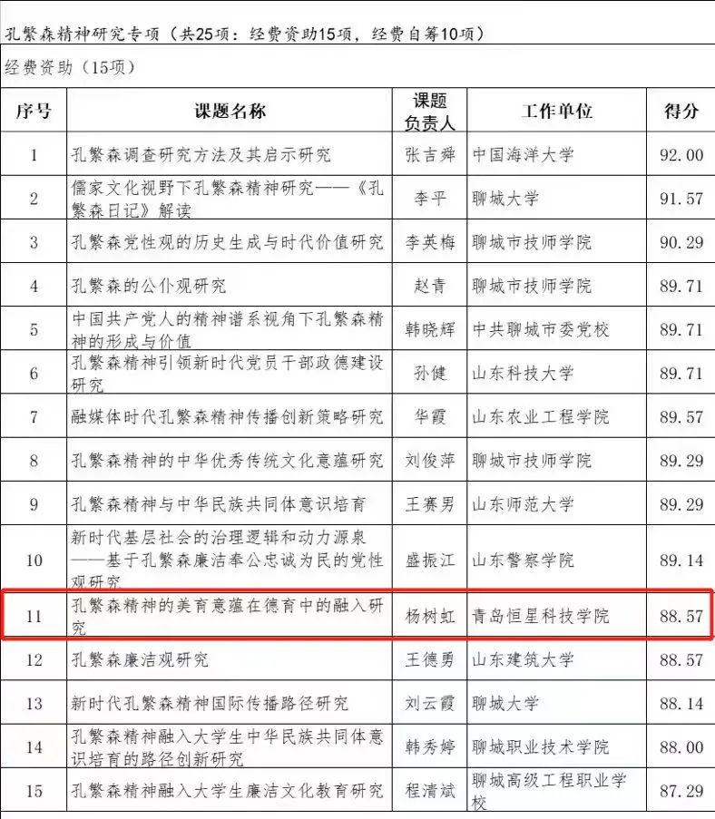 近日,山东省社科联2023年度人文社会科学课题合作专项经资格审查和专家组评审,最终立项课题190项,其中,孔繁森精神研究专项25项,杨树虹教授的《孔繁森精神的美育意蕴在德育中的融入研究》,经山东省社科联2023年度人文社会科学课题合作专项经资格审查和专家组评审,成功获批立项。