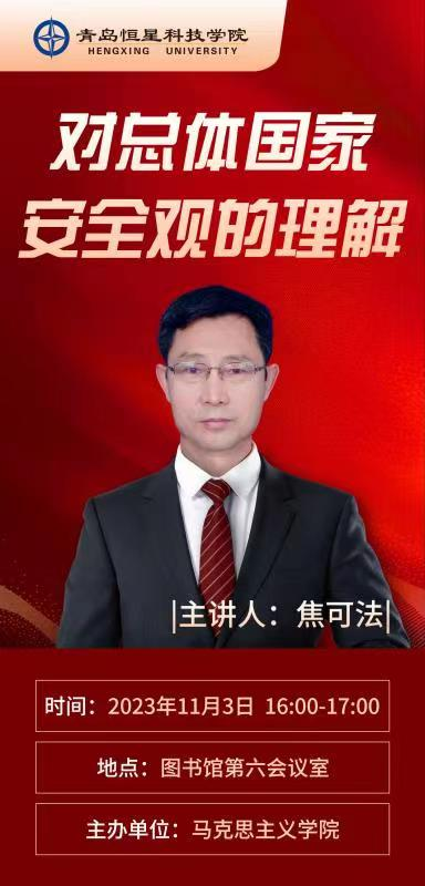 在我国新时代的发展进程中,国家安全已经成为国家发展的重要基石。总体国家安全观的提出,为新时代国家安全发展提供了重要指导,深刻体现了中国共产党和国家领导人对国家安全发展的深邃思考和战略布局。11月3日下午,马克思主义学院“教授开讲啦”系列第七期讲座在图书馆第六会议室举行。马克思主义学院特聘教授焦可法围绕保证国家安全是头等大事、坚持总体国家安全观和开创国家安全工作新局面三个方面进行了深入剖析。